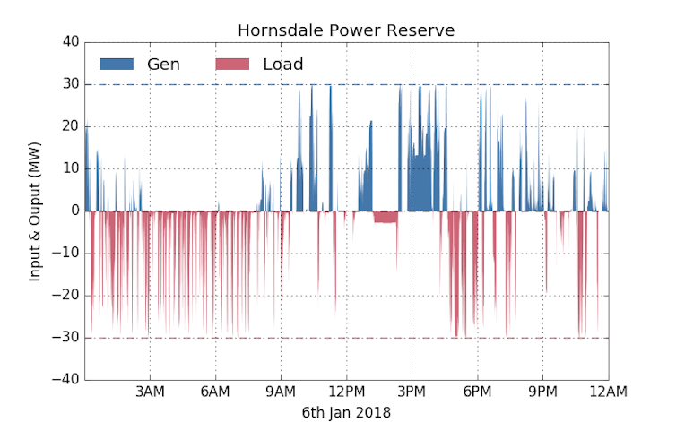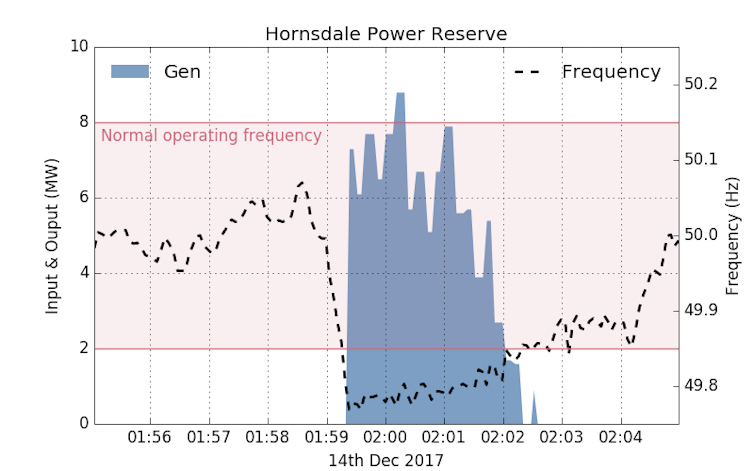 This is one of the services that the Hornsdale Power Reserve has been providing. The figure below shows how the Hornsdale Power Reserve responded to one incident on power outage, when one of the units at Loy Yang A tripped on December 14, 2017.