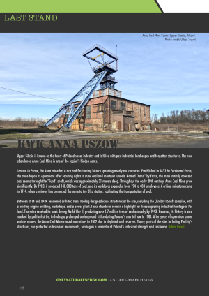 Between 1914 and 1919, renowned architect Hans Poelzig designed iconic structures at the site, including the Chrobry I Shaft complex, with a hoisting engine building, workshops, and a power plant. These structures remain a highlight for those exploring industrial heritage in Poland. The mine reached its peak during World War II, producing over 1.7 million tons of coal annually by 1943. However, its history is also marked by political strife, including a prolonged underground strike during Poland’s martial law in 1981. After years of operation under various names, the Anna Coal Mine ceased operations in 2012 due to depleted coal reserves. Today, parts of the site, including Poelzig’s structures, are protected as historical monuments, serving as a reminder of Poland’s industrial strength and resilience.